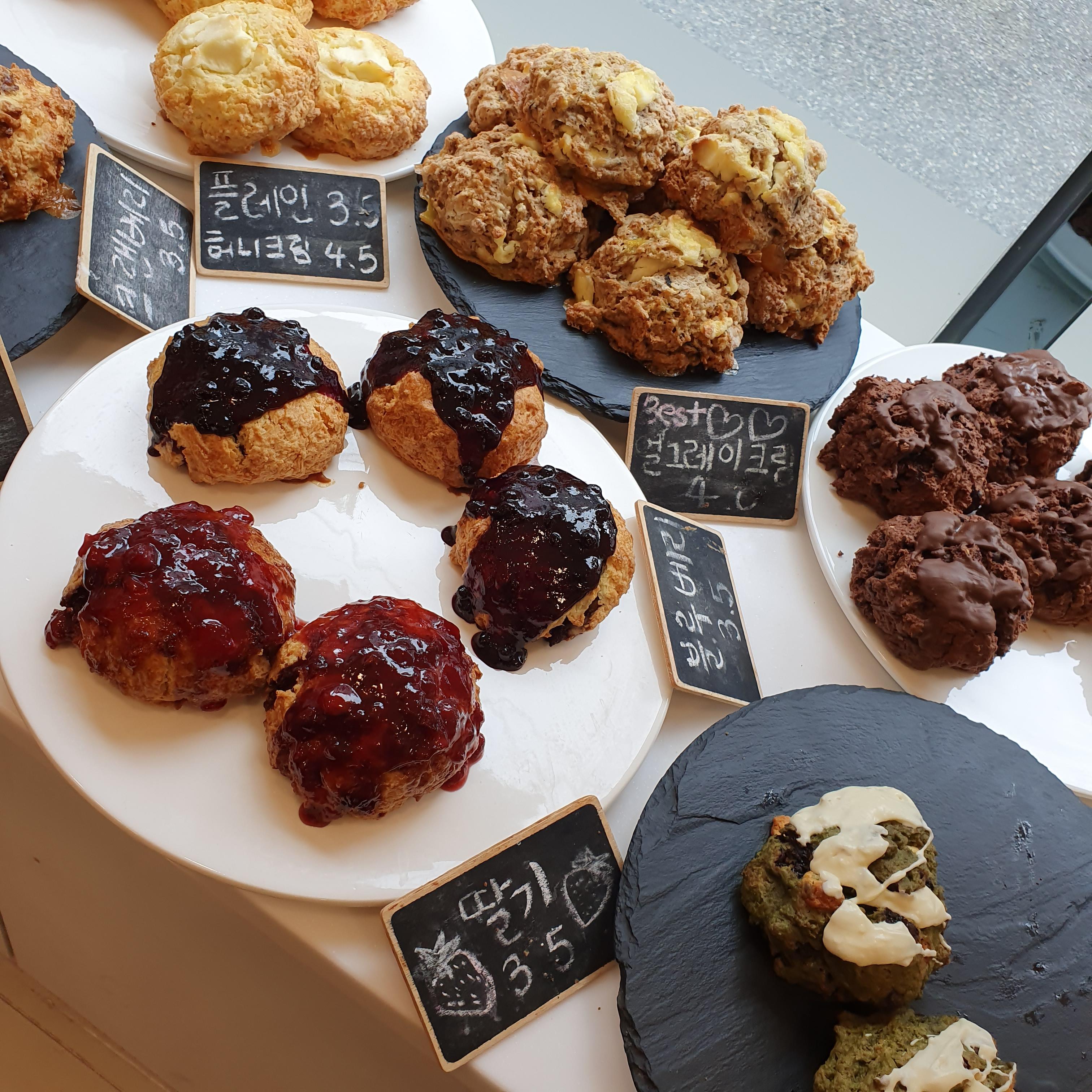 스콘종류만 10가지가 넘게 판매하고있는데 말차스콘, 초코아몬드스콘, 얼그레이크림, 블루베리, 허니크림, 딸기, 오렌지 등등 정말 다양한 종류가 있었습니다.